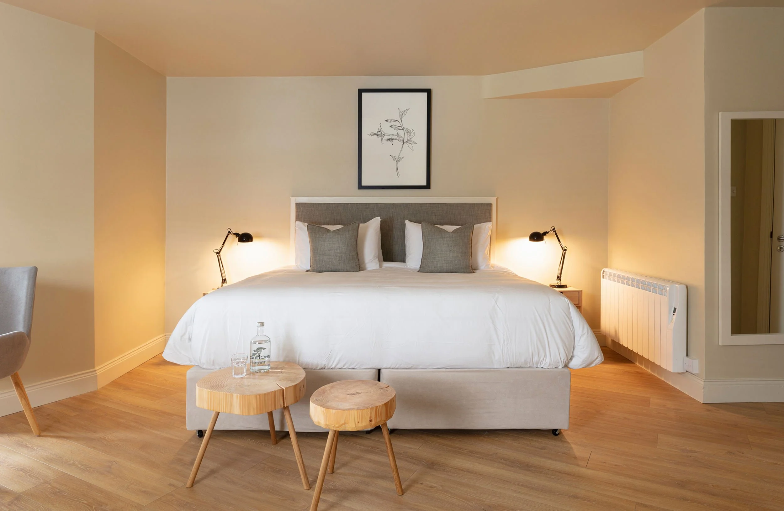 Our compact and cosy rooms are individually named and decorated with tones and fabrics in keeping with the ‘Lagom’ theme of ‘not too much, not too little, just right,’ acknowledging the natural beauty that surrounds us in Kenmare.